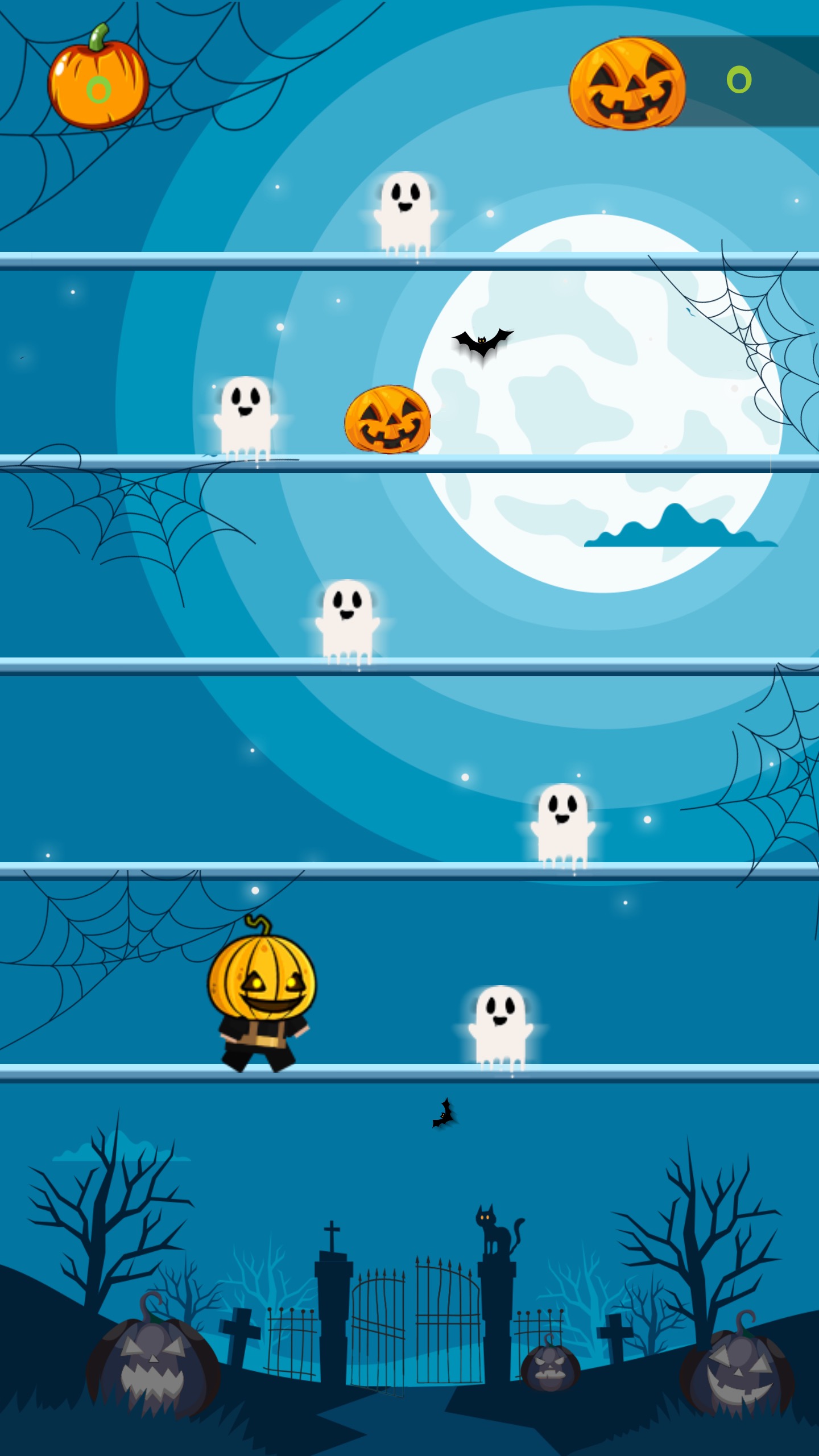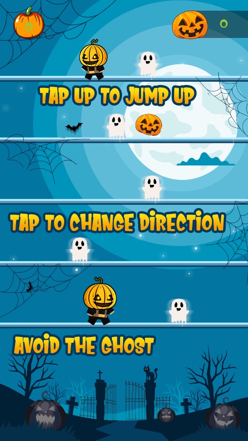 Enter a Scary world of candy, and fun to Help Johnny Find his way home from the terrifying Halloween night. Johnny went trick or treating but got lost on the way home, and stayed out too late. Now graveyards opened up, ghosts appeared in the night and monsters are trying to capture our young friend. Help him get home by collecting the candies, pumpkins, and powerups to avoid the monsters that rule the night on Halloween.